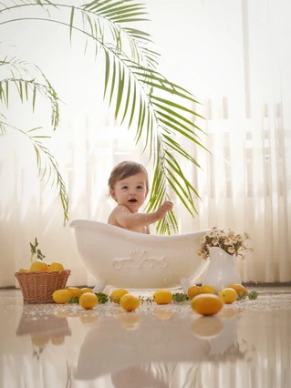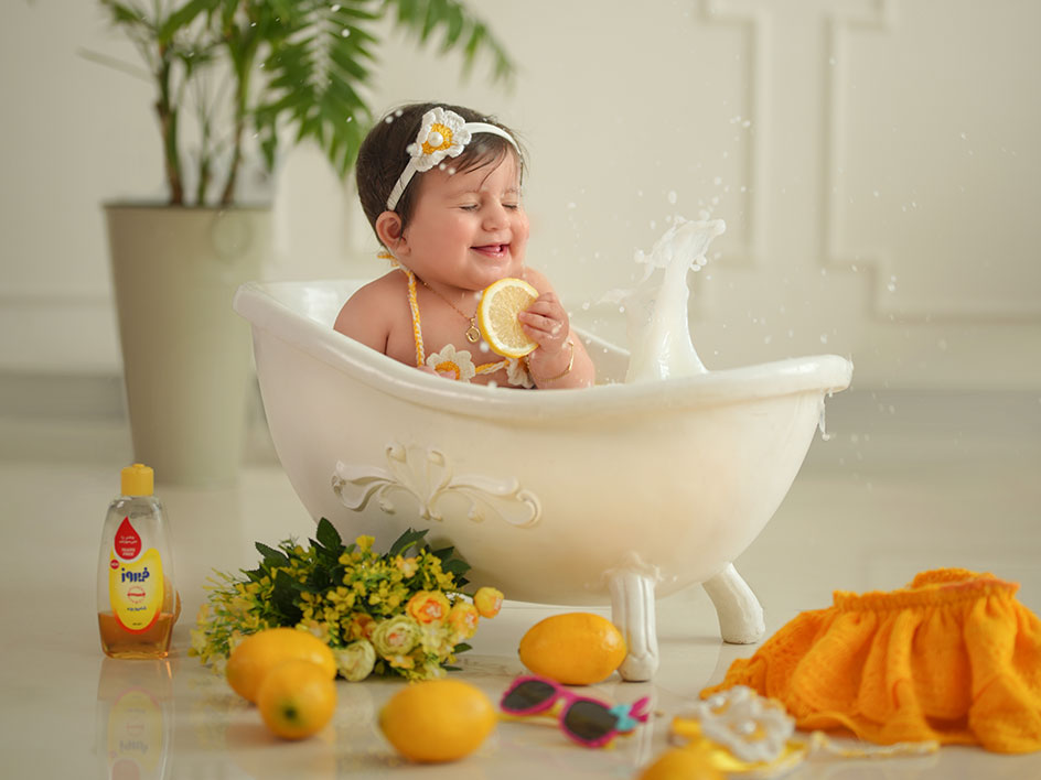 دکور وان لیمویی ما با وان سفید بامزه و لیموهای تازه، عطر و طراوت بهار را برای کوچولوی شیرینتان زنده میکند. نور طبیعی و رنگهای شاد این صحنه، عکسهایی سرشار از تازگی و سرزندگی میسازد که خاطرهای ماندگار برای همیشه خواهد شد.