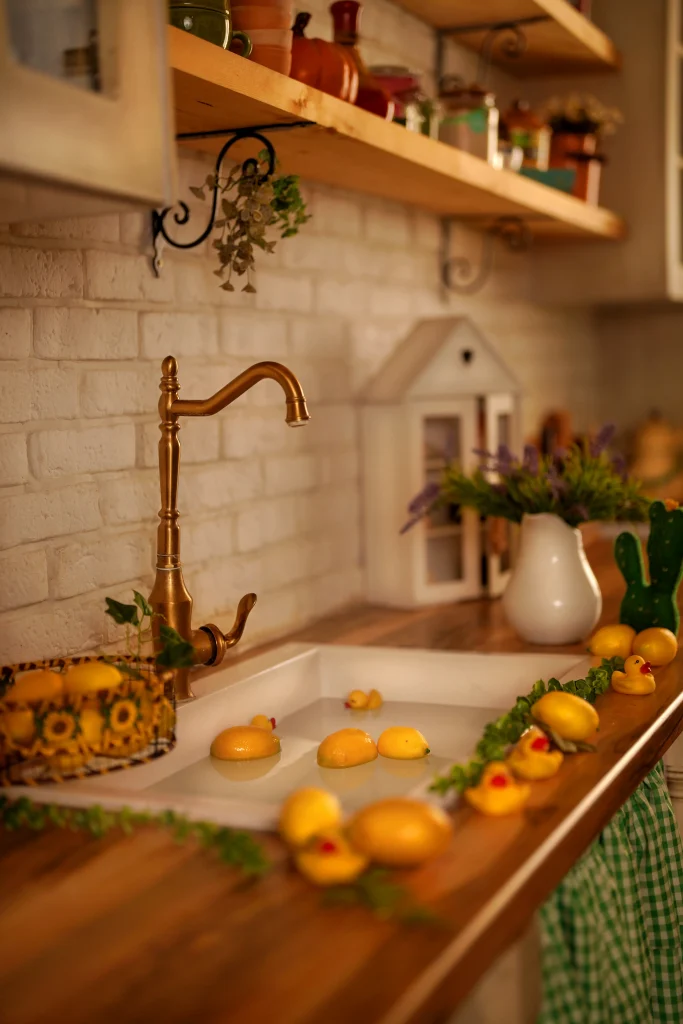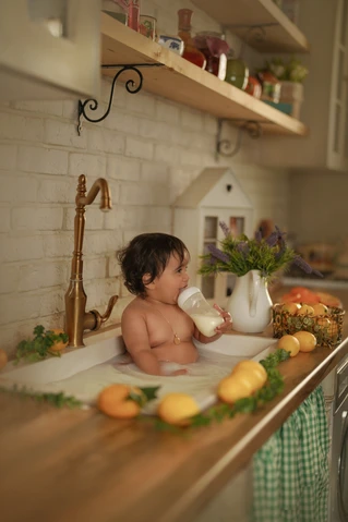 دکور سینک ظرفشویی ما با وان سفید و میوههای رنگارنگ مثل توتفرنگی و لیمو، فضایی متفاوت و سرشار از طراوت میسازد. کودک در این محیط ساده و دوستداشتنی مینشیند و عکسهایی طبیعی و پر از رنگ و زندگی برای یادگاری ثبت میشود.